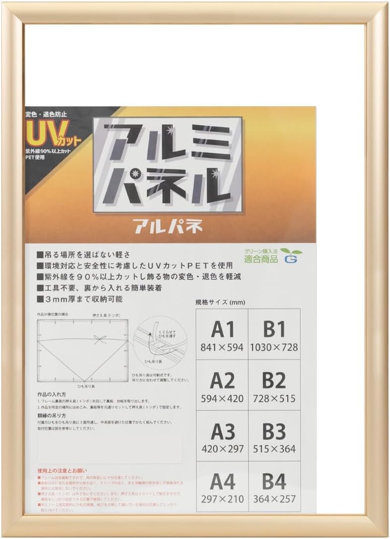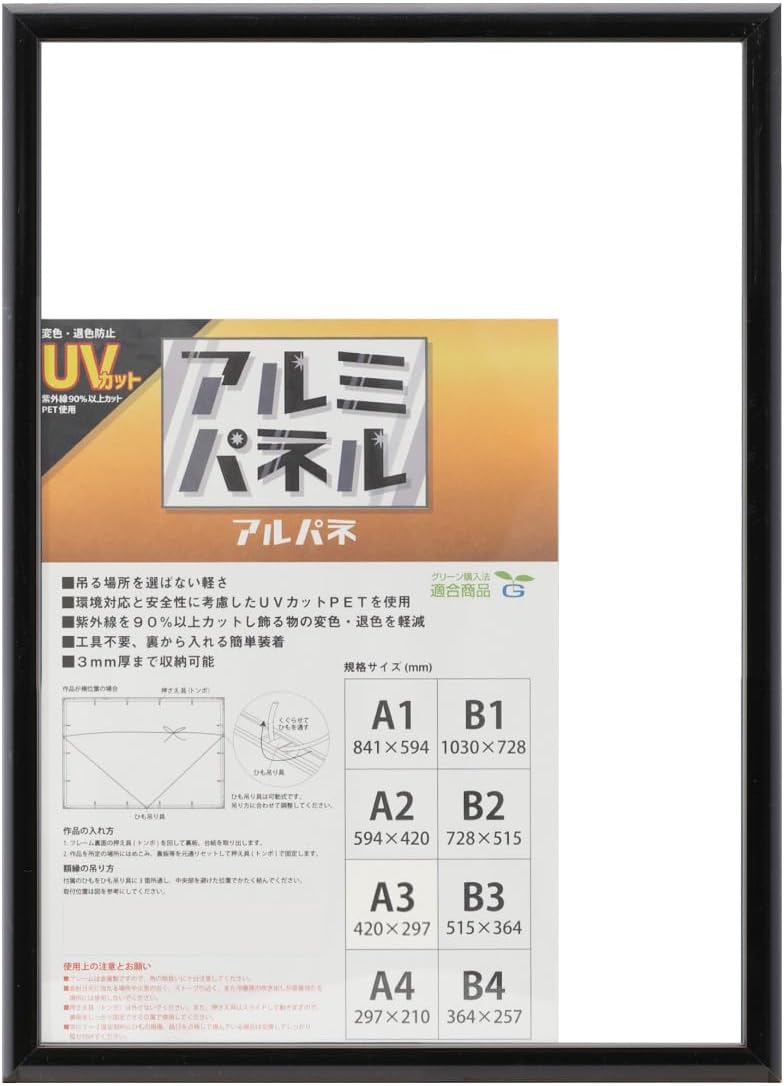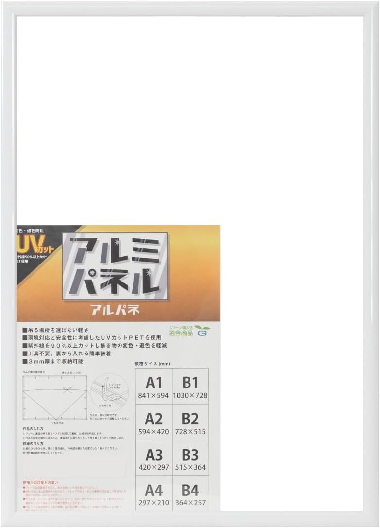 Available in a wide variety of colors. Generously rounded aluminum panel frame. It can be used in a variety of occasions, such as a display in a shop or a bulletin board in the office. OA standard size supports digital printing paper. Lightweight and easy to carry. You can hang it anywhere. Environmentally friendly and safe PET blocks over 90% of UV rays to prevent discoloration and fading. Plastic pushers (dragonfly) and string hangers, so you can easily insert your artwork without any tools and make it quick to clean. The string hanging hardware is movable. Adjust according to the hanging method. Note Do not use in places exposed to direct sunlight or in places near fire such as stoves or stoves.