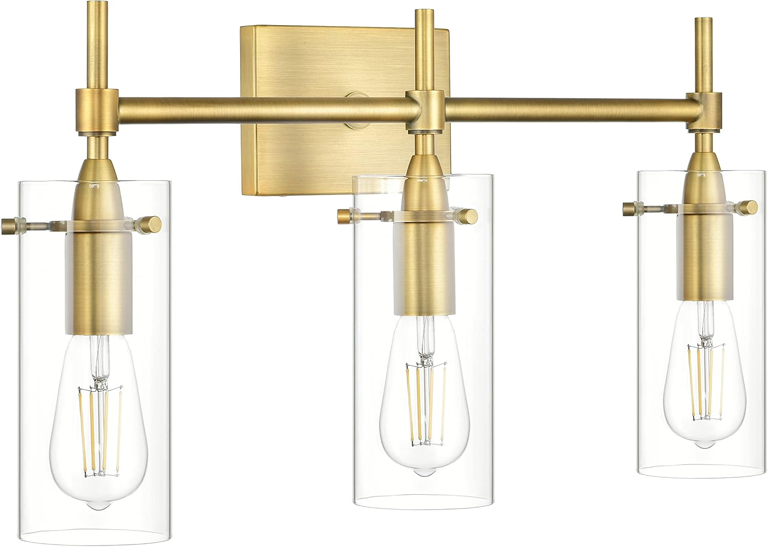 Farmhouse inspired, the Effimero four light bathroom vanity light wall sconce is transitional home decor at its best. The simple yet elegant metal finish with clear glass shades lends itself to placement in a bathroom, entryway or dining room, bringing a classically minimal vibe to the space. Perfect for bathrooms, corridors, dining rooms, living areas, bedrooms and other spaces. Metal construction, antique brass finish Measures 27 inches wide by 12 inches high. Extends 6 inches from the wall Shades measure 3.5 inches in diameter by 8 inches high Dimmable when used with dimmable bulbs and compatible dimmer switch Uses three E26-base bulbs, 60W max (not included) Works with most bulbs - compatible with smart bulbs or most medium base bulbs up to 60W 1-year manufacturer warranty with US based customer service UL listed