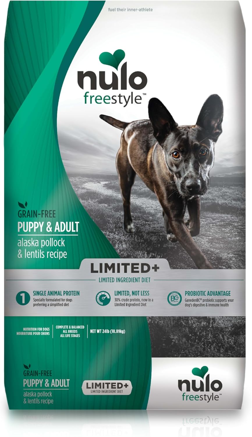 Fuel Incredible with Nulo FreeStyle Limited+ Salmon Grain Free Dog Food Dry - 24lb Bag Natural pet food for small, medium and large breeds. Limited never means less. Nulo FreeStyle Limited+ Puppy & Adult Salmon recipe is made for dogs who thrive on a simplified diet without compromising nutrition or taste. With real deboned salmon as the single animal protein, this recipe delivers 30% crude protein to fuel lean muscles, strength, and endurance while keeping ingredients simple and purposeful. In this limited ingredient salmon dog food, balanced omega-3 and omega-6 fatty acids promote soft, hydrated skin and glossy coats, while taurine and essential amino acids support heart health and sustained vitality. Advanced BC30 probiotics and natural prebiotic fibers encourage digestive balance, nutrient absorption, and immune strength, giving sensitive tummies everything they need, and nothing they don’t. What’s left out matters too. No chicken, eggs, grain, corn, pea protein, wheat, soy, white potatoes, rice or tapioca, and never any artificial colors or preservatives. Only clean, carefully selected ingredients chosen by leading animal nutritionists. Dogs don’t just eat Nulo’s incredible kibble, they love it. Every delicious recipe is taste-tested to win over even picky eaters, so bowls are licked clean at every mealtime! Nulo dog food is pet nutrition with intent, inspired by the same standards athletes demand for themselves: high protein, low carbs and low glycemic index. Thousands of pet parents already see the difference: leaner bodies, shinier coats, and happy tail wags. With Nulo dry dog food, you’re not simply filling a bowl, you’re fueling your pet’s health, happiness, and lifetime of incredible moments together.